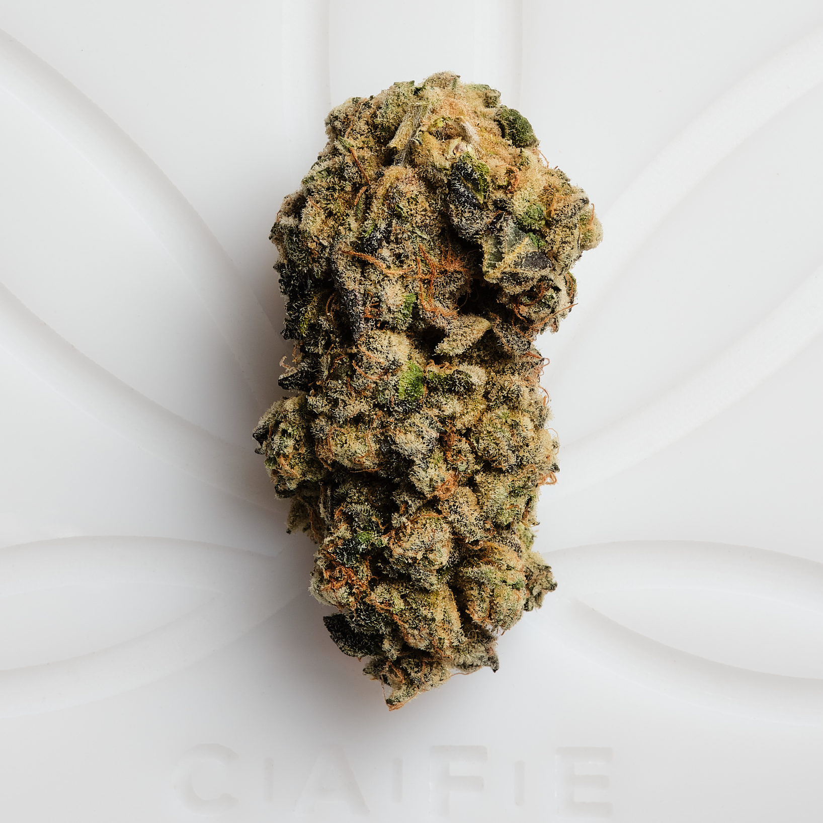 Animal Face buds are dense and frosty, featuring dark green hues with purple undertones and bright orange hairs. Each nug is coated in a thick layer of sticky trichomes, highlighting its potency and premium quality.